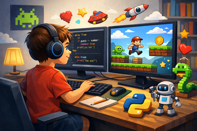 It isn't. Children aged 10 and above can build working, playable games using Python, and the process of doing so teaches programming fundamentals faster and more durably than almost any other project type. Python game development for kids isn't a shortcut around real coding. It is real coding, applied to something children actually care about.