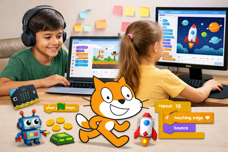 Scratch is real coding. It teaches sequences, loops, conditionals, variables, event-driven logic, and parallelism: the same foundational concepts present in Python, Java, and every other professional language. The block interface removes syntax as a barrier, which is pedagogically deliberate. A child who builds a complex multi-stage game in Scratch and then moves to Python is not starting over. They are translating familiar ideas into new syntax.